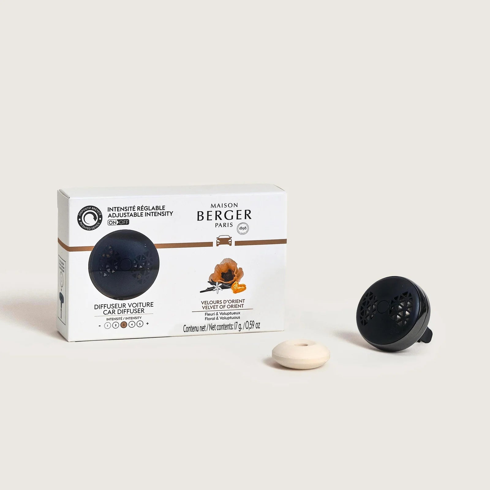 De verpakking bevat een autodiffuser en één geursteen in de geur Velours d'Orient.