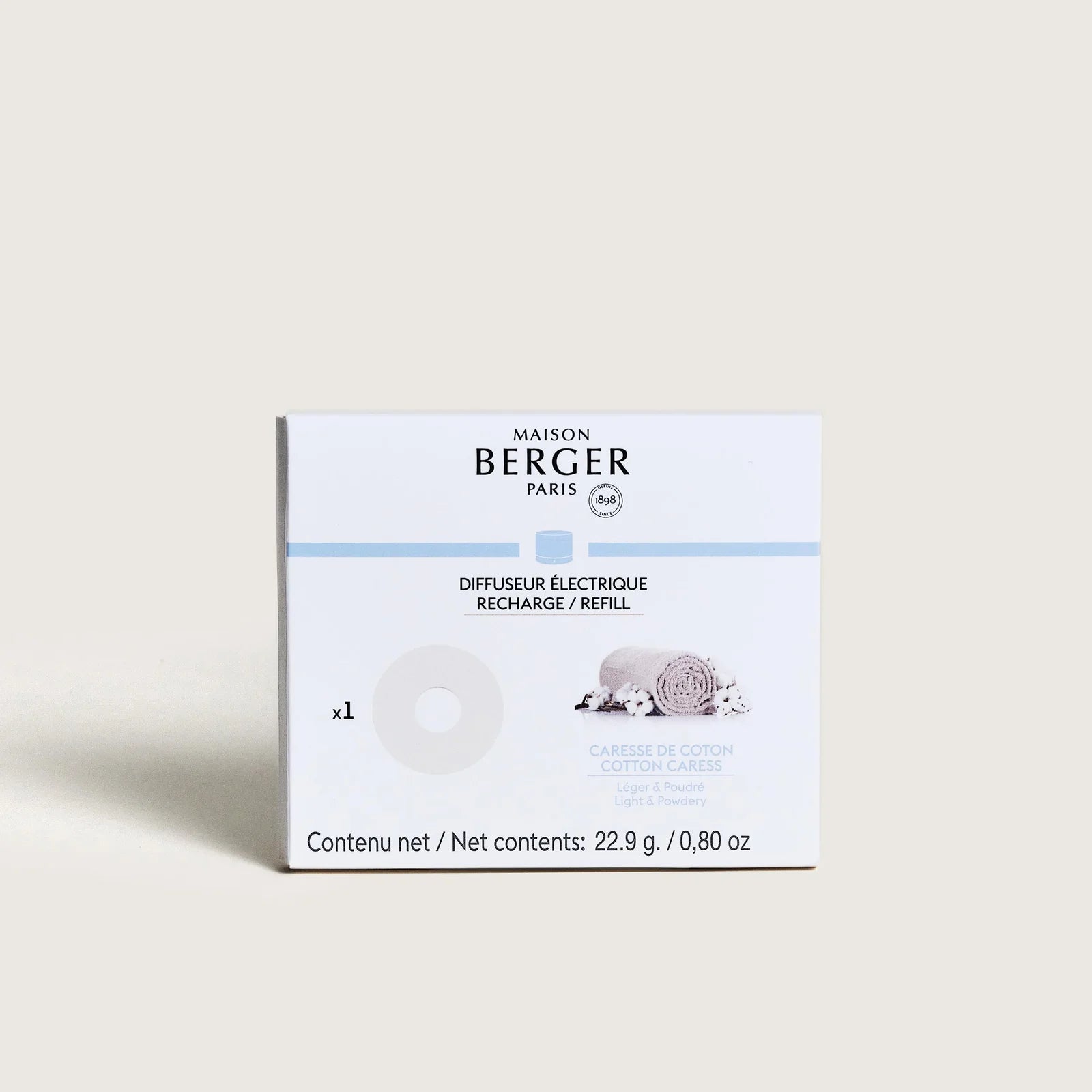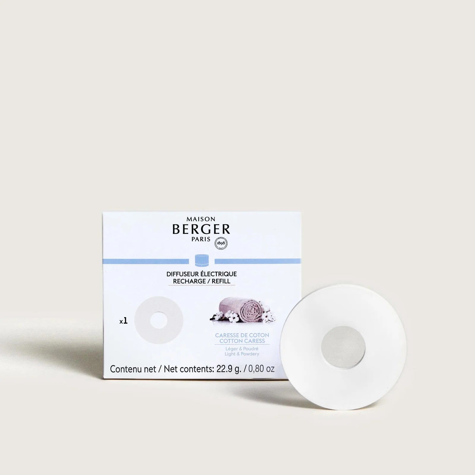 Maison Berger Huisparfum Caresse de Coton biedt een geruststellende en elegante geur met een aangename, weldadige sfeer. Deze keramische navulling voor de Nomad parfumdiffuser biedt 6 à 8 weken continue geurervaring met een bloemig, omhullend karakter.